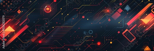 A flat vector background with simple shapes and lines in dark colors, featuring orange and red geometric patterns on the right side of an empty space for text or design elements