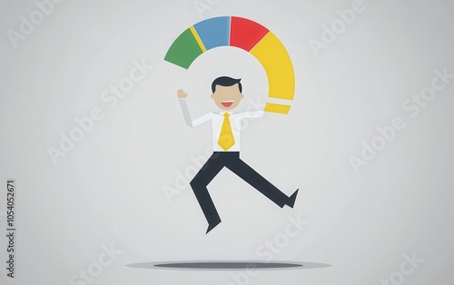 A flat vector image of a businessman in a yellow tie jumping, with a colorful semicircle chart floating above him.