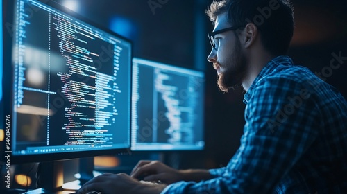 A focused developer programming on multiple screens with code in a dimly lit environment, showcasing modern technology use.