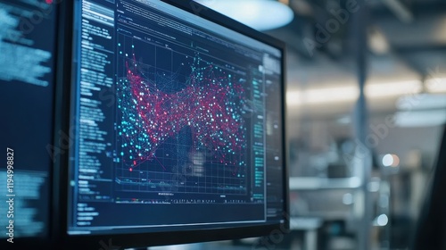 A focused image of a computer screen displaying machine learning algorithms being trained with large datasets and complex equations that illustrate the process of optimizing manufacturing