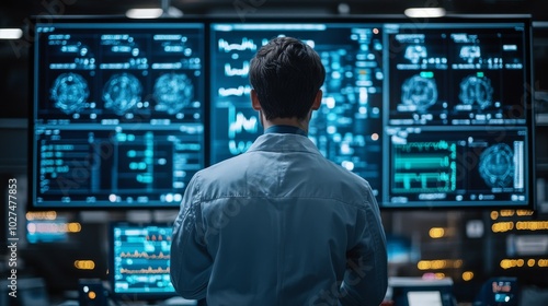 A focused individual wearing a lab coat stands in front of glowing monitors that display critical medical data, ensuring accurate patient care in a clinical setup.