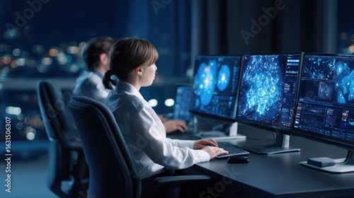 A focused individual works at multiple monitors displaying data visualizations in a high-tech environment, emphasizing technology and analytics.