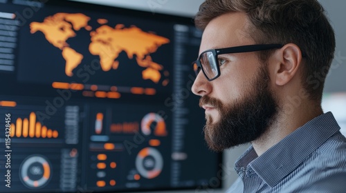 A focused man analyzes data on a screen showing graphs and a world map in orange tones, highlighting insights and trends.