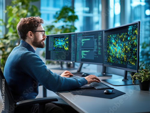 A focused professional analyzes data on multiple monitors in an office filled with greenery, showcasing modern technology and productivity.