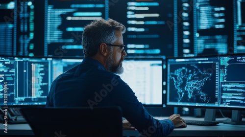 A focused professional analyzes data on multiple screens in a modern tech environment, showcasing the essence of digital analytics.