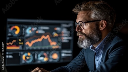 A focused professional analyzing data on a computer screen in a dark environment.