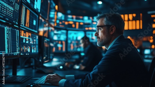 A focused professional analyzing data on multiple monitors in a modern control room, emphasizing technology and teamwork.