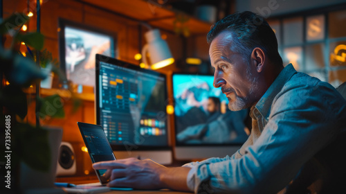 A focused professional edits on a Smart tablet in a studio, surrounded by screens displaying multimedia projects.