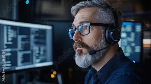 A focused professional wearing a headset and glasses, engaged with computer screens displaying data and code in a modern tech environment.