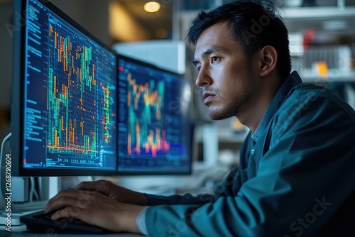 A focused programmer analyzes data on dual monitors, immersed in complex code and charts.