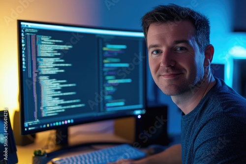 A focused programmer works late into the night, diligently coding on his computer screen.