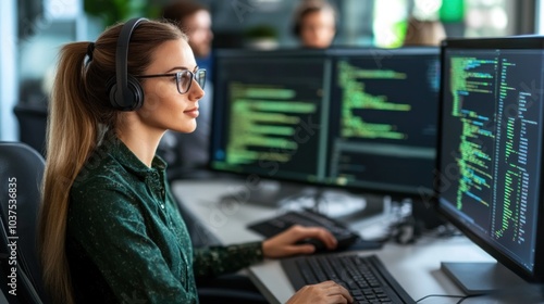A focused woman with long hair and glasses engages in programming at her desk, utilizing multiple monitors filled with colorful code in a bright, contemporary office