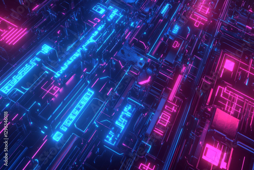A futuristic 3D abstract background featuring a vast network of glowing digital circuits and fluid metallic surfaces that seamlessly blend into one another. The design is filled with radiant neon blue