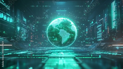 A futuristic 3D globe surrounded by floating graphs and data points, with dynamic lines and glowing overlays, vibrant electric blue and green tones, sharp digital details,