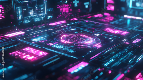 A futuristic AI system controlling neon-lit holograms, surrounded by real-time data and machine learning algorithms.