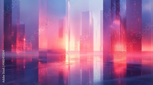 A futuristic city reflected in a vibrant, neon-lit water.