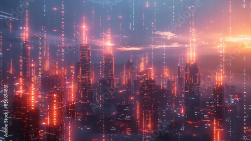 A futuristic city skyline with blockchain data streams flowing across the buildings