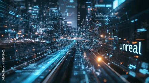 A futuristic city street with glowing blue lines, data, and the word 'unreal' in the distance.