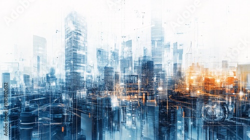 A futuristic cityscape blended with architectural blueprints and engineering tools in a double exposure design