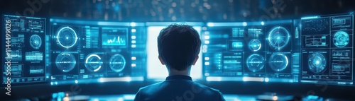 A futuristic control room, glowing dashboards wrapping around walls, a person in sharp focus, scifi aesthetic, low angle