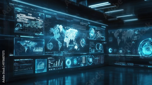 A futuristic control room with digital displays showcasing global data and analytics.
