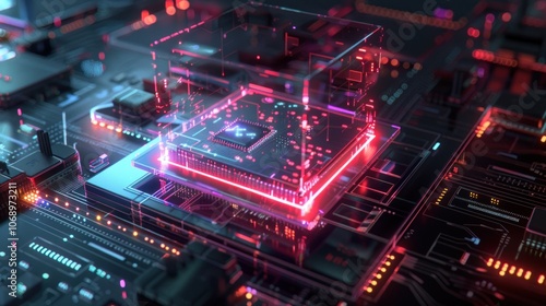 a futuristic CPU processor that uses holographic technology, with transparent display elements and data holograms flowing around the core components