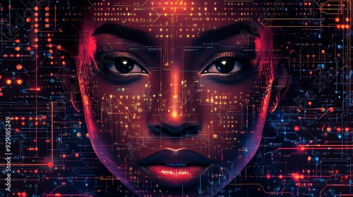 A futuristic, cybernetic face illuminated by digital circuitry and glowing elements, representing artificial intelligence, technology, and advanced digital interfaces.