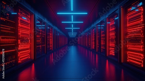 A futuristic data center illuminated by red and blue lights, featuring rows of server racks, creating a high-tech atmosphere.