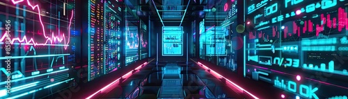 A futuristic data center with glowing digital displays representing financial metrics, stock market graphs, and data analytics.