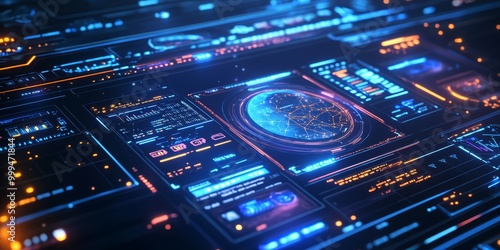 A futuristic design featuring space-themed tech elements, with glowing holograms, interactive star maps, and sleek data panels.