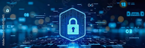 A futuristic digital backdrop with a glowing shield and binary code, representing cybersecurity, data encryption, and protection of digital assets in a secure virtual environment