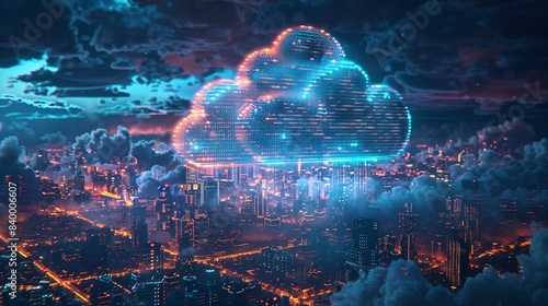 A futuristic digital cloud hovers over a vibrant cityscape, illustrating advanced cloud computing and urban technology.