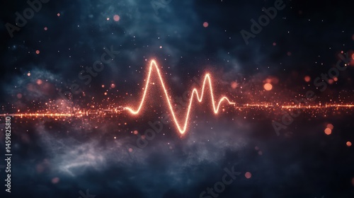 A futuristic digital heartbeat waveform made of soft glowing particles floating in a dark misty environment deep
