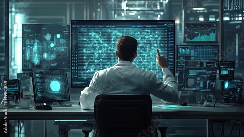 A futuristic digital interface displays a human skeleton and brain scans in a high-tech laboratory.