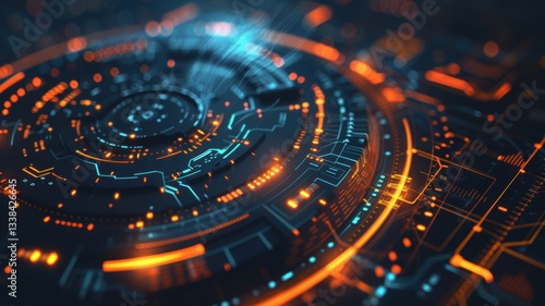 A futuristic digital interface featuring glowing circuits and patterns in orange and blue, representing advanced technology and data visualization.
