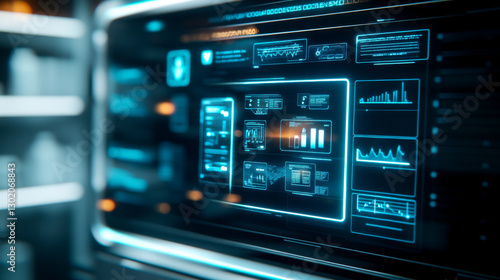 A futuristic digital interface with glowing graphs and data metrics displayed on a sleek panel.