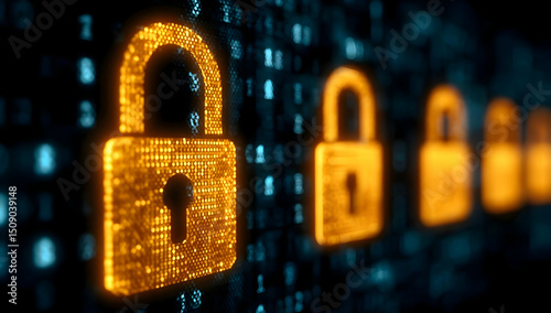 A futuristic digital locks illustration displaying vibrant glowing padlocks on a binary code background, symbolizing cybersecurity and data protection.