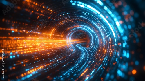 A futuristic digital tunnel with neon light trails and data streams, emphasizing a high-tech cyberspace visualization with dynamic motion blur and glowing effects.