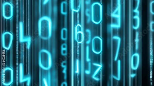 A futuristic display of glowing blue binary numbers cascading in vertical lines, representing digital data and technology.