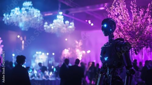 A futuristic event with a metallic robot and elegantly dressed attendees under chandeliers and floral accents