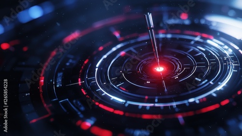A futuristic, high-tech interface featuring a glowing red center surrounded by intricate circular patterns and dynamic lighting effects.