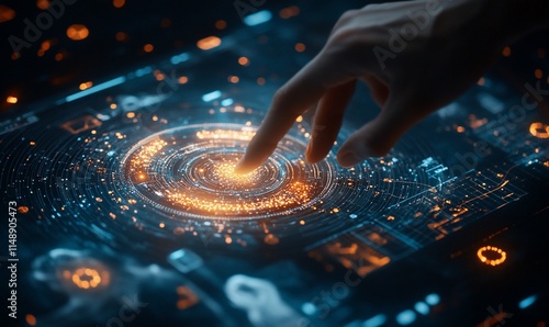 A futuristic interface with a hand interacting with glowing data elements.