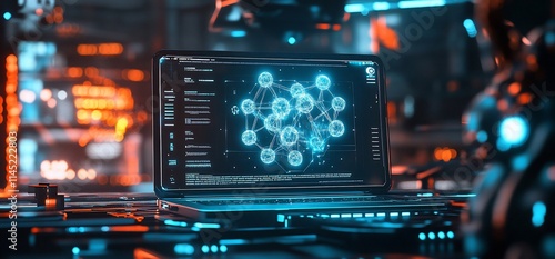 A futuristic laptop displaying a complex data network in a high-tech environment.