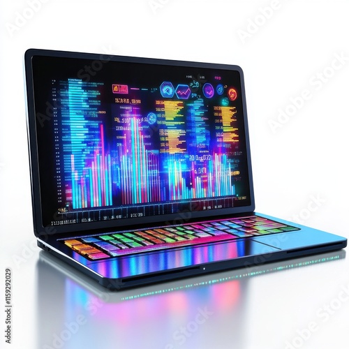 A futuristic laptop showcasing vibrant data analysis graphics on its screen, exuding a high-tech ambiance.