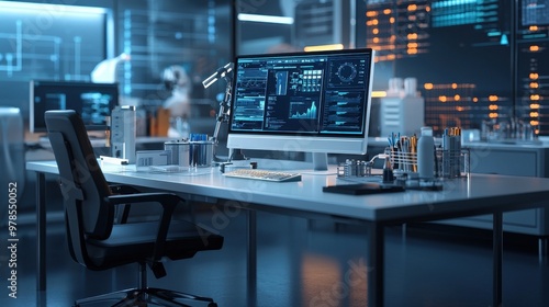 A futuristic office workspace featuring a sleek computer setup with data analytics on display, surrounded by advanced technological elements.