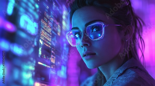 A futuristic portrait of a woman with glowing glasses against a vibrant digital backdrop.