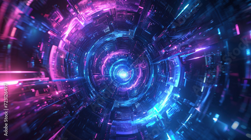 A futuristic presentation background with a neon blue and purple color scheme, featuring a 3D abstract geometric shape in the center