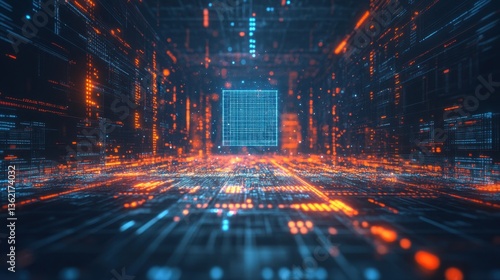 A futuristic quantum computing processor floating in a digital matrix of information.