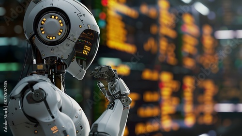 A futuristic robot analyzing financial data with a serious expression, generative AI