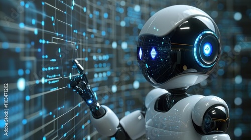 A futuristic robot interacts with a digital interface, showcasing advanced technology.